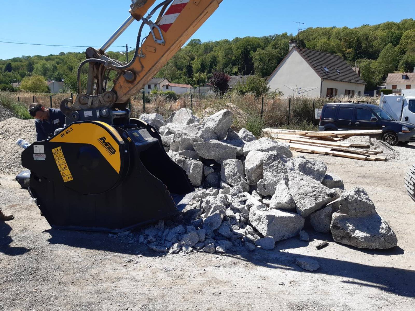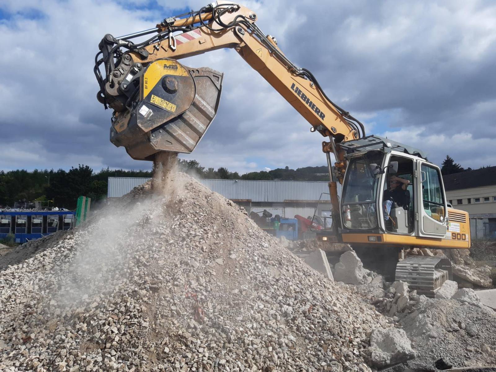 Notre Godet Concasseur MBCRUSHER BF80, est capable de concasser et de revaloriser tous types de déblais de chantier, bordures Béton, Bordure Granit, Regards béton inutilisables, croutes d'enrobés, blocs de graves ciments traités.
